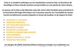 Suite à un incident technique sur les installations survenus hier, la fourniture de chauffage et d'eau chaude sanitaire est perturbée sur une partie de notre réseau.