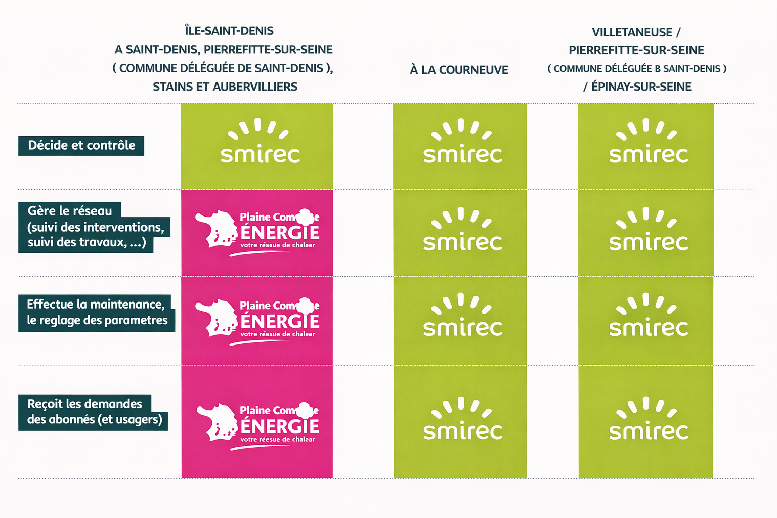 - À Villetaneuse, Pierrefitte-sur-Seine ( commune déléguée à Saint-Denis) et Epinay-sur-Seine, le Smirec facture directement la fourniture de chaleur aux abonnés (sociétés HLM, copropriétés, équipements publics...).