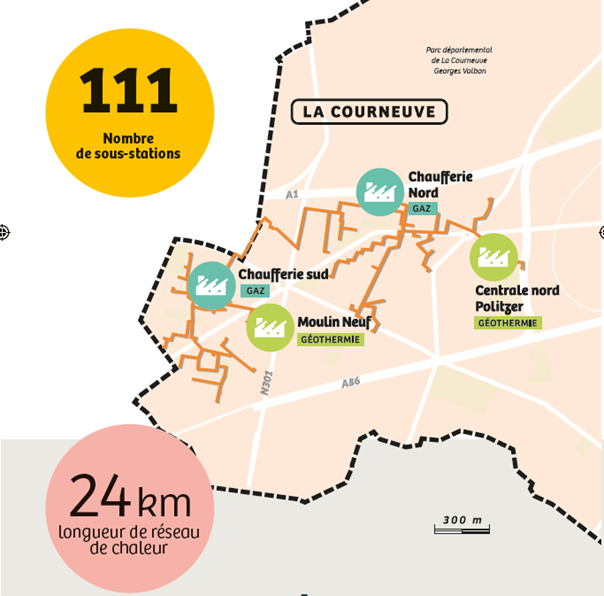 À La Courneuve, l’eau géothermale est prélevée à environ 1 700 mètres de profondeur, à une température d’environ 59°C.