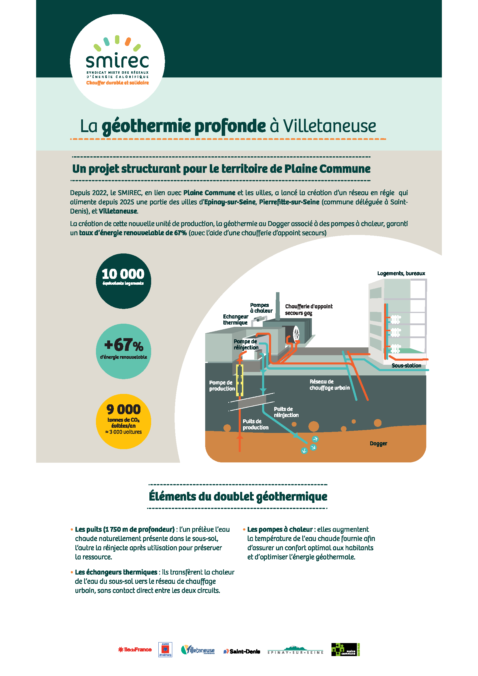 En seulement trois ans, ce projet a été rendu possible par le volontarisme et la coopération active des trois villes et de ses élus ainsi que par l’engagement déterminant des collectivités et des bailleurs, mobilisés pour accélérer la transition énergétique du territoire et déployer ce nouveau réseau. La centrale de Villetaneuse est un moteur important du développement des énergies renouvelables locales,avec un potentiel de production de 55 000 MWh par an issus de la géothermie profonde associée aux pompes à chaleur. Elle contribue à réduire les émissions de CO₂ de 9 000 tonnes par an et accompagne lamontée en puissance du réseau de chaleur du SMIREC, désormais l’un des plus importants d’Île-de-France.